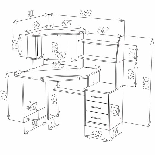 Ищете удобный стол для учёбы или работы? Тогда вам нужен СК-39. Угловая модель компьютерного стола обладает всеми качествами для продуктивной деятельности. В частности, стол имеет просторную столешницу, где можно установить монитор размером 52х48 см. Здесь же без труда можно заниматься письменными работами. Также оборудованы выкатная полка для клавиатуры, отсек для дисков и ниша под системный блок. Кроме того, под столешницей удобно расположилась полка для книг, а в правой части стола – три выдвижных ящика, один из которых закрывается на ключ. Над ящиками образуется открытое пространство – на своё усмотрение здесь можно разместить какие-либо принадлежности или аксессуары. Верхняя часть, то есть надстройка, содержит полки, а её крыша позволяет разместить элементы современной оргтехники.  Теперь этот стол можно собрать как левый, так и правый (универсальная сборка).