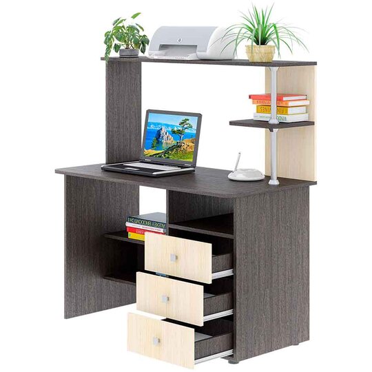 Стол компьютерный СК-6 интересен сочетанием простоты, эргономичности и низкой цены изделия при обязательном и безупречном качестве. Здесь есть всё для продуктивной работы: широкая столешница с предусмотренным местом под монитор  534х870, выкатная полка для клавиатуры. Также сверху расположена надстройка, где можно разместить оргтехнику, документы и книги, а справа от монитора – полки для необходимых принадлежностей. Также СК-6 обладает двойной полкой для книг под столешницей и стационарной тумбой с тремя выдвижными ящиками. Они снабжены шариковыми направляющими, что обеспечивает полное выдвижение. Функциональное дополнение к тумбе - открытая ниша.