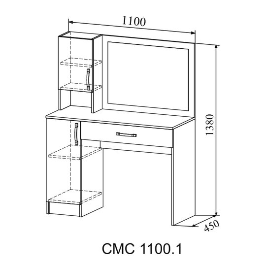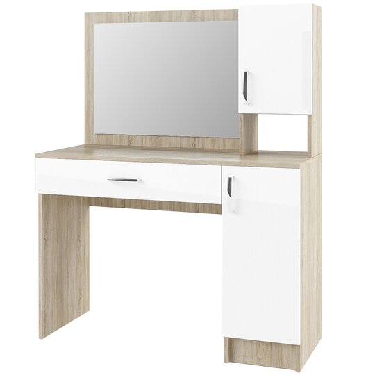 Стол макияжный с надстройкой Софи - удобный современный туалетный столик с вместительным выдвижным ящиком и левосторонней тумбой под столешницей и надстройкой в виде зеркала с дополнительным отделением для хранения над столешницей. Стол макияжный изготовлен из ЛДСП в цвете дуб сонома с фасадами в цвете белый глянец. Информация от производителя: Обращаем ваше внимание, что рассверловка боковин ящиков является односторонней (по левой стороне).