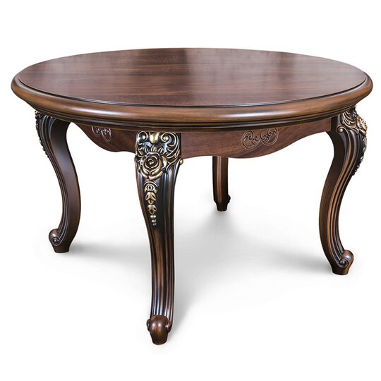 Стол журнальный Илона- это солидный журнальный столик в благородной древесной тонировке с круглой столешницей толщиной 6см на четырех фигурных опорах, декорированных патинированной золотом лепниной.Продукция производится в Ставрополе компанией «ЭРА». Пользователю достаточно выбрать в каталоге приглянувшееся изделие, а менеджеры нашей компании отправят его в любой район Крыма бесплатно