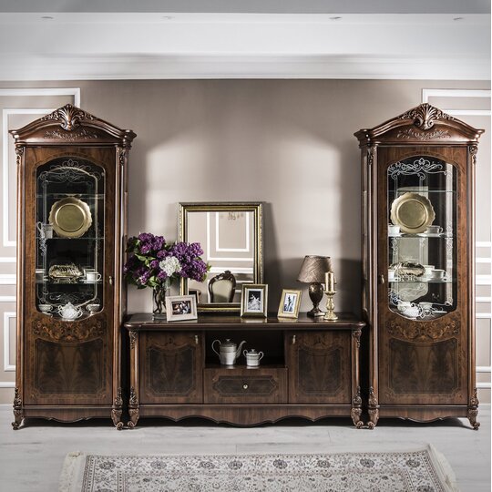 Набор для гостиной Илона - роскошный, выполненный в благородной темной тонировке караваджо, комплект мебели будет притягивать взгляд и украшать гостиную классического стиля. Гостиная декорирована богатой позолоченной лепниной и фантазийной фрезеровкой на стекле.
