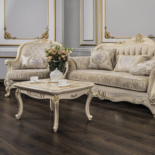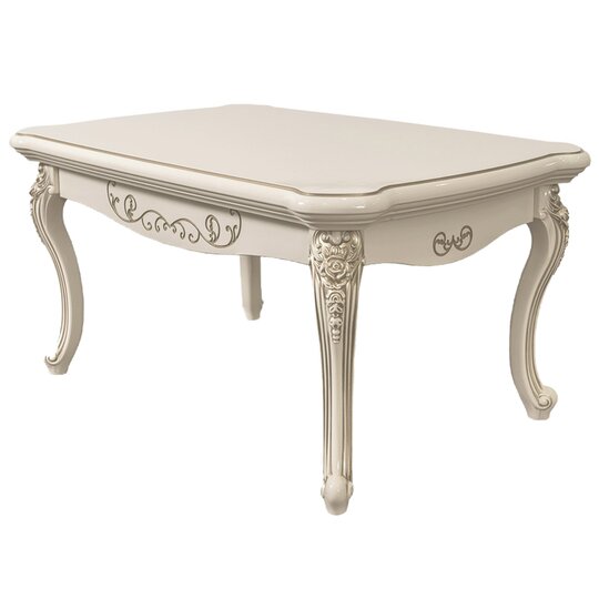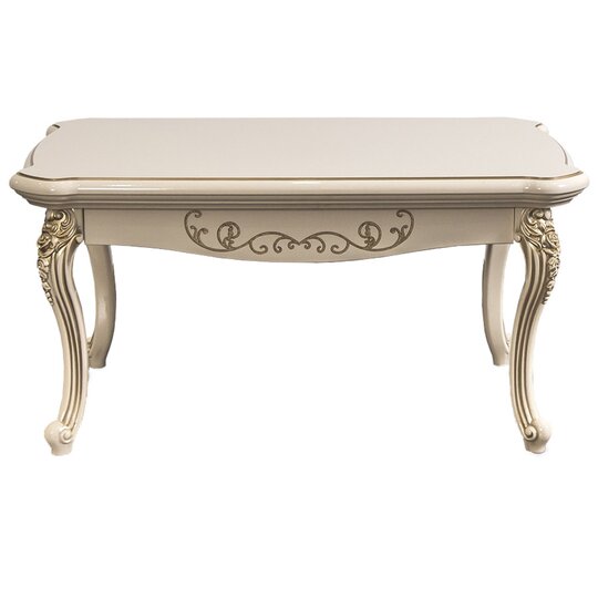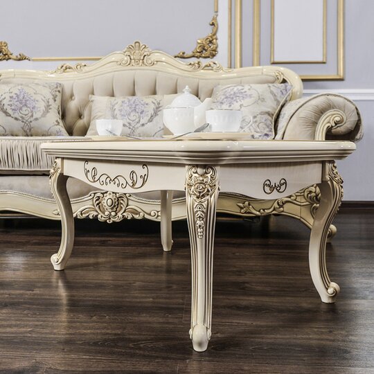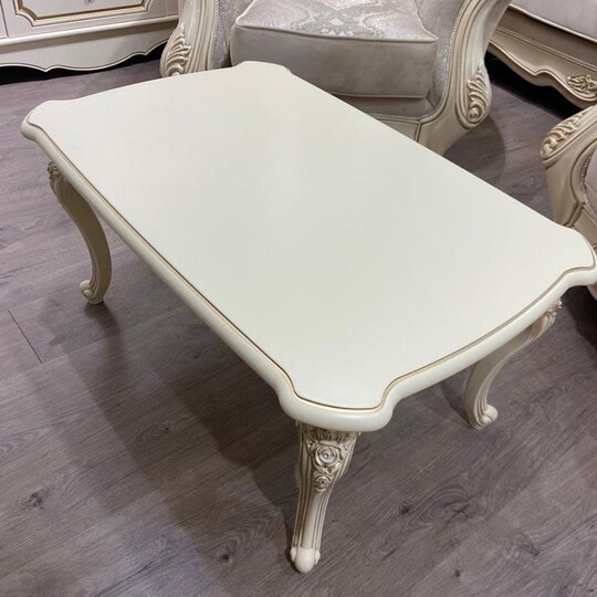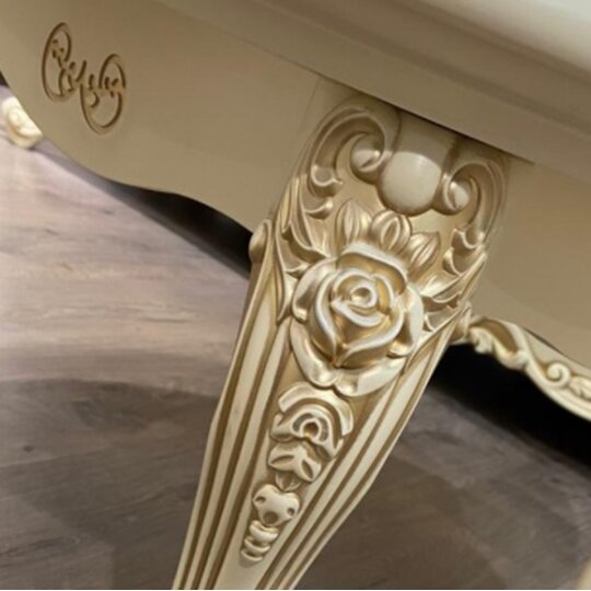 Роскошный прямоугольный столик с резной столешницей толщиной 6см на четырех фигурных опорах, декорированных лепниной, покрытой золотой патиной.Продукция производится в Ставрополе компанией «ЭРА». Пользователю достаточно выбрать в каталоге приглянувшееся изделие, а менеджеры нашей компании отправят его в любой район Крыма бесплатно