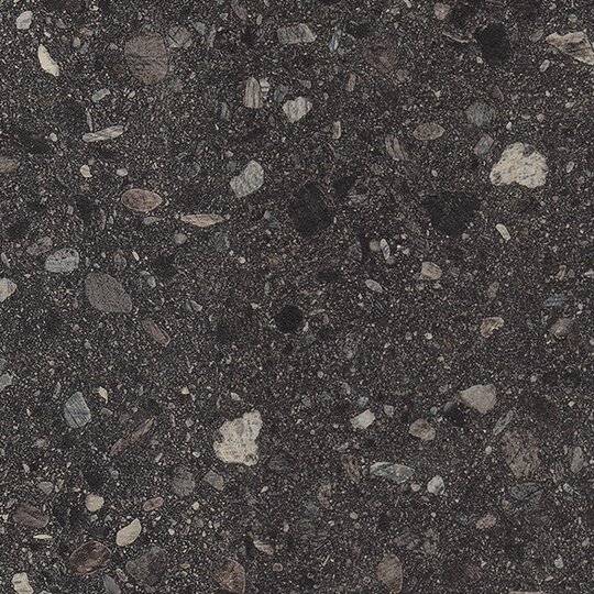 В соответствии с тенденцией к использованию имитаций терраццо была создана выразительная репродукция камня Камень Вентура чёрный. Модными являются комбинации с чёрными однотонными или древесными декорами. Со светлыми классическими древесными репродукциями декор столешниц создаёт современный контраст. Благодаря разноцветным камням в рисунке декора он особенно хорошо гармонирует также с пастельными цветами разных оттенков. Структура ST76 Минерал шероховатый матовый придаёт декору рельефность, на ощупь напоминающую шероховатую поверхность камня.