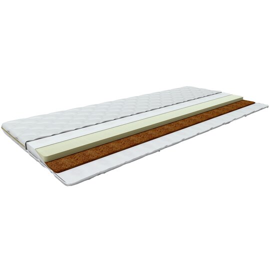 Тонкий беспружинный матрас на основе пенополиуретана высокой плотности и кокосового волокна. Жесткая кокосовая сторона выравнивает неровности спального места, пенополиуретан делает спальное более комфортным. Чехол изделия выполнен из хлопкового жаккарда, который гипоаллергенен, устойчив к истиранию и приятен на ощупь.