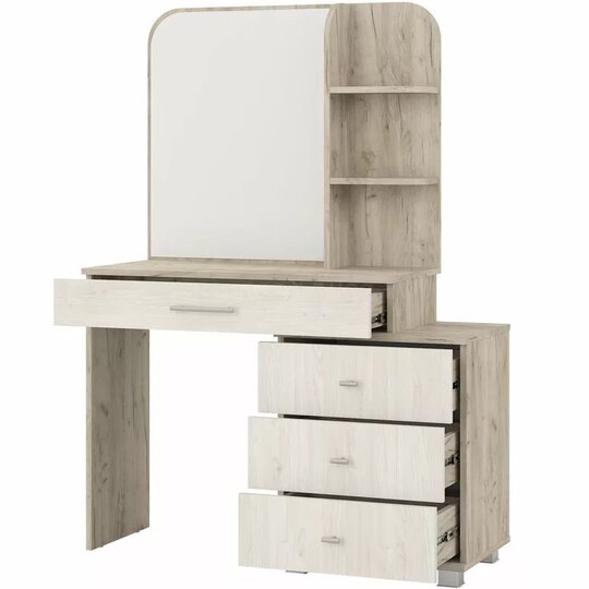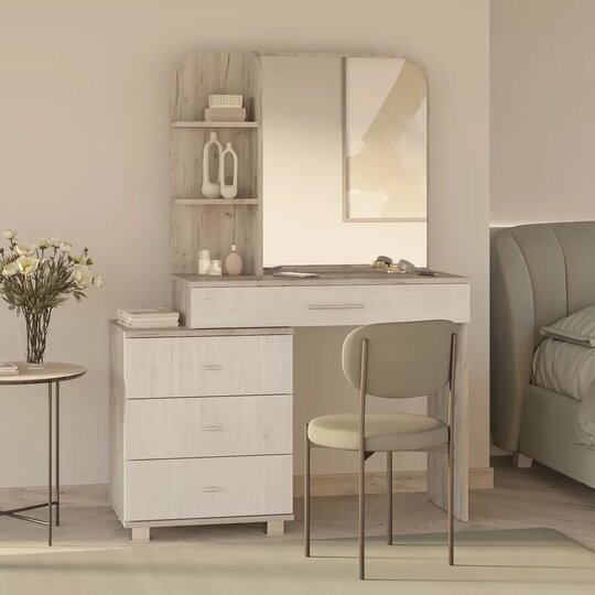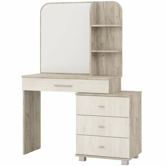 Трюмо Оливия 4-25100 прекрасно впишется в интерьер спальни и поможет создать удобное место для наведения красоты. У вас будет комфортное место, где вы с большим удовольствием сможете нанести макияж и создать безупречную укладку. Открытые полки и широкий выдвижной ящик, и вся косметика, мелкие аксессуары и украшения будут у вас под рукой. Трюмо прекрасно сочетает в себе простоту и функциональность.