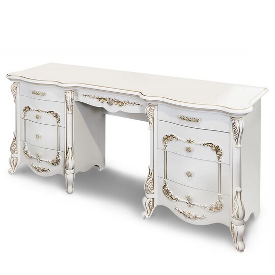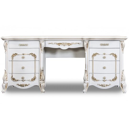 Столик туалетный Анна Мария - роскошный туалетный столик с тремя выдвижными ящичками под фигурной столешницей и с двумя тумбами с отделениями для хранения за распашными дверцами. Столик выглядит по-королевски благодаря накладному,  патинированному золотом, декору.