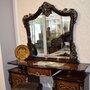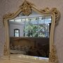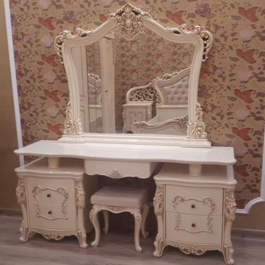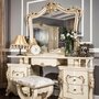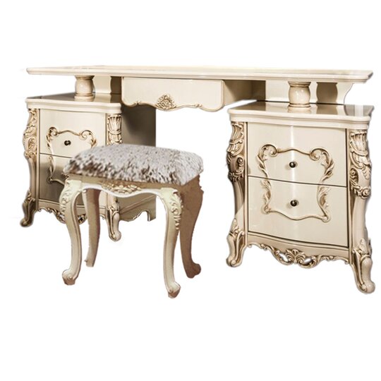Туалетный стол с пуфом-по-королевски декорированный туалетный столик выполнен с фигурной столешницей и скомпонован из двух тумб с двумя выдвижными ящиками каждая и небольшим выдвижным ящичком в подстолье между двух ниш. Фасады и столешница декорированы патинированной золотом фрезеровкой. Тумбы декорированы резными панелями в основании и торцевыми балясинами, переходящими в изогнутые опоры. Пуфик имеет мягкое текстильное сиденье на четырех грациозных резных опорах.