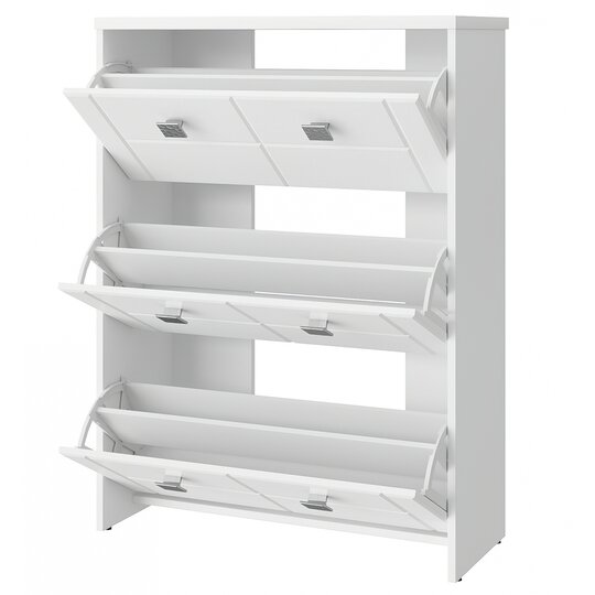 Шкаф для обуви Изабель ИЗ-55К прекрасно впишется в интерьер прихожей, поможет раз и навсегда забыть о проблеме разбросанной обуви. Тумба оснащена тремя откидными дверцами со специальными обувными отсеками для аккуратного размещения обуви всей семьи. Сверху на тумбе вы сможете расположить ключи, бумажник, косметику и аксессуары для обуви. Столешница выполнена из ЛДСП 25 мм. Фурнитура: металлизированные квадратные ручки.