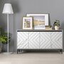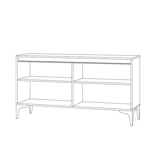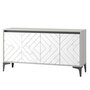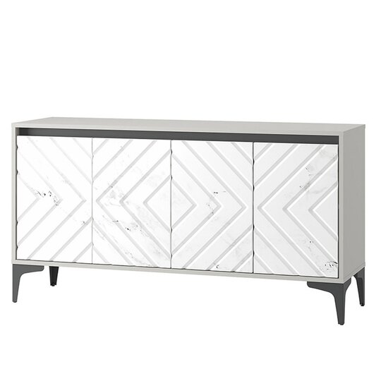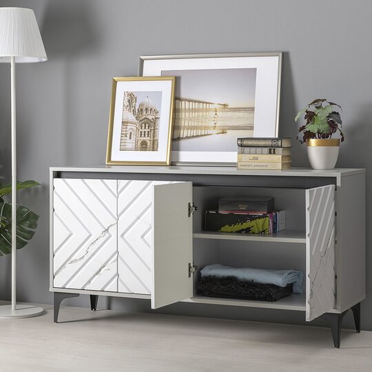 ТВ тумба Муар-функциональный элемент мебели для гостиной. Тумба предназначена для удобного размещения на ней телевизора или других предметов интерьера, а также для хранения предметов быта, посуды, столового белья и различных аксессуаров. Тумба оснащена черными металлическими опорами, двумя вместительными отделениями с полкой за четырьмя распашными дверями с доводчиками, открывающимися за верхний край.