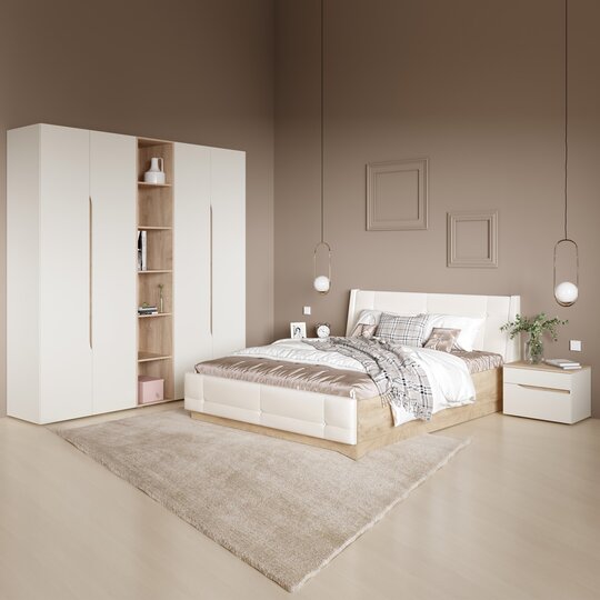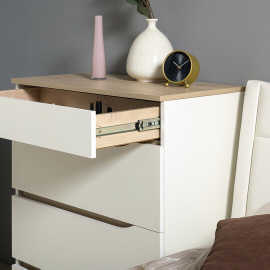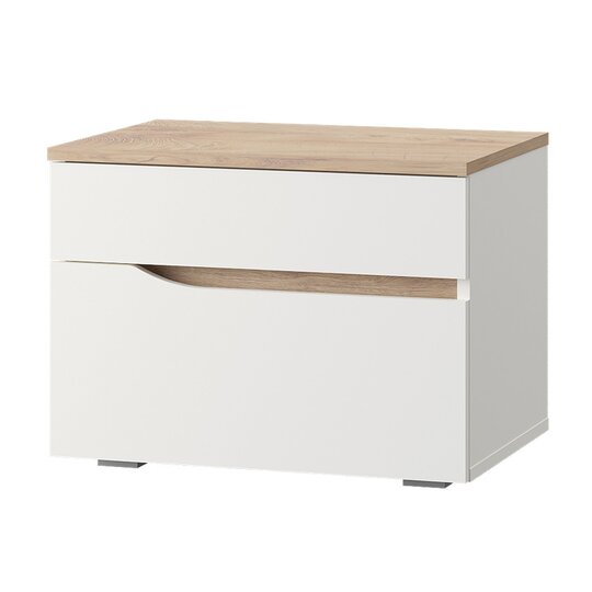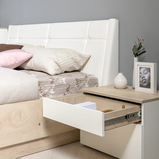 Тумба прикроватная с двумя выдвижными ящиками на шариковых направляющих полного выдвижения. Лицевую фурнитуру заменяет стильный вырез, за которым видно древесный декор корпуса. Регулируемые пластиковые опоры.
