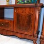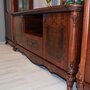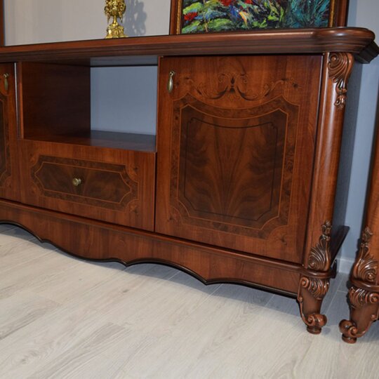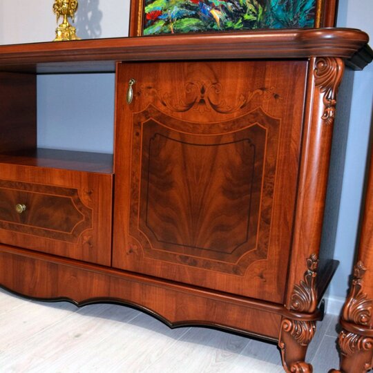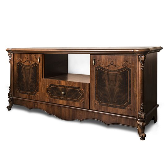 ТВ тумба Илона-комфортная элегантная тумба выполнена в темной тонировке караваджо с фрезерованными фасадами и ручками в цвете бронза. Тумба имеет фигурную столешницу, фигурное основание на изогнутых ножках, два отделения за распашными дверцами, между которыми расположены ниша для аудио- и видеоаппаратуры и небольшой выдвижной ящичек для мелочей.