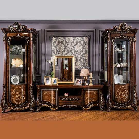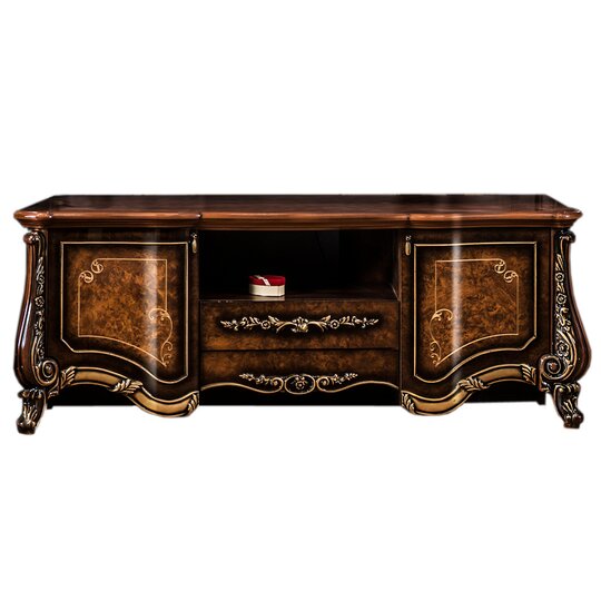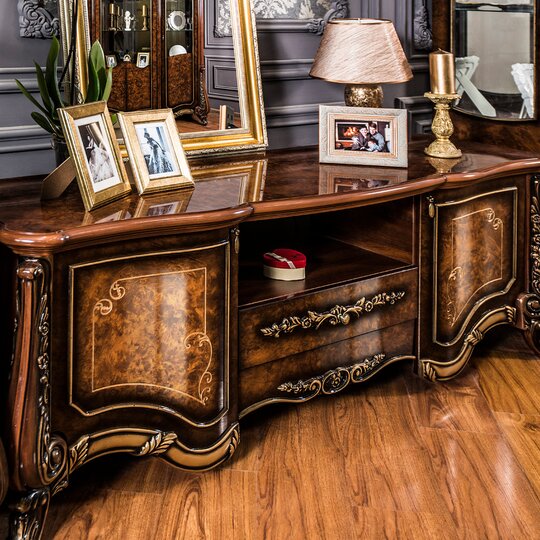 Тумба ТВ Марселла - великолепная телевизионная тумба выполнена в стиле барокко в светлой (крем) и темной (корень дуба) глянцевой тонировке. Тумба имеет фигурную фрезерованную столешницу, нишу, выдвижной ящичек и два боковых отделения за распашными дверцами. Тумба декорирована патинированной фрезеровкой и великолепной лепниной. В основании тумбы резной наличник и две передние изогнутые невысокие опоры.