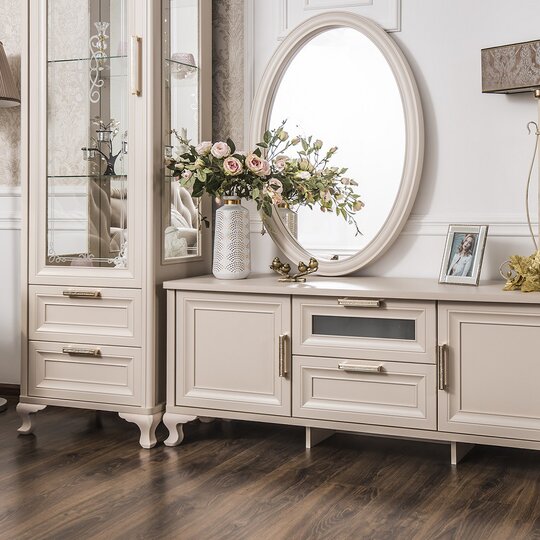 Утонченные элементы, роскошная обивка, витиеватые накладки доставят эстетическое наслаждение своим владельцам. Бежевый цвет «мокко» мебели позволяет визуально увеличить пространство спальни, подчеркнуть важные детали, добавив в пространство легкости и света.