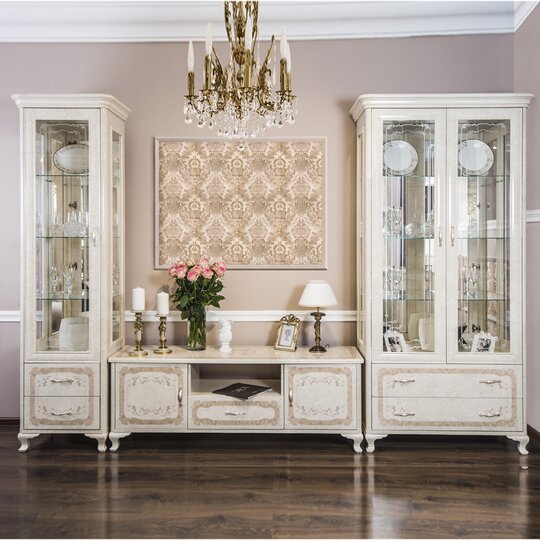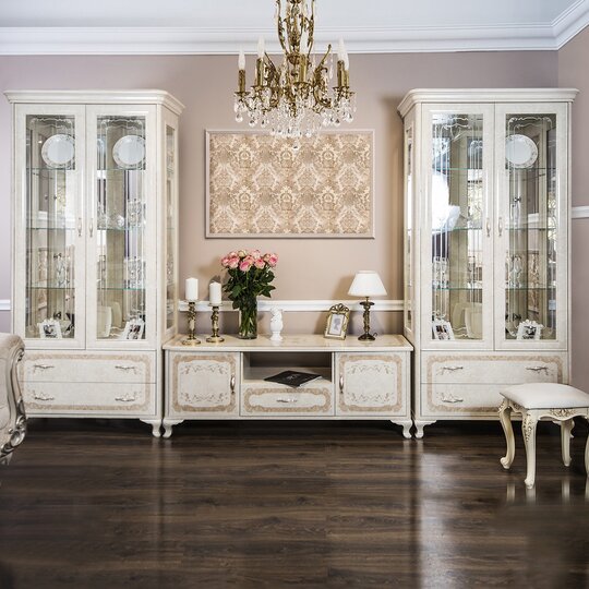Мебель для гостиной «Патрисия» — стильное решение, отличающееся роскошным видом и великолепными функциональными характеристиками. Корпус изделий изготовлен из высококлассной ЛДСП, а декор — из экологичных ППУ и ПУ. Мебель, размещенная в классическом интерьере, создает уютную и комфортную атмосферу.