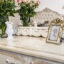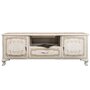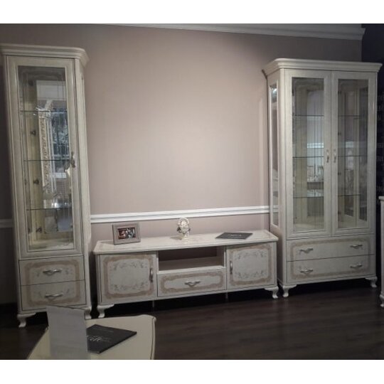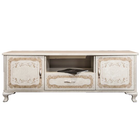 ТВ тумба - комфортная телевизионная тумба с роскошной столешницей, с центральными нишей для сопутствующей аппаратуры и выдвижным ящичком, и с двумя боковыми отделениями для хранения за распашными дверцами. Тумба выполнена в тонировке крем корень глянец с богатым декором.