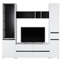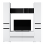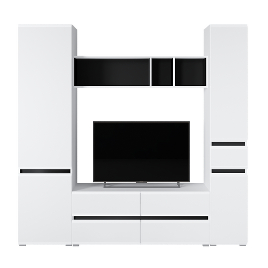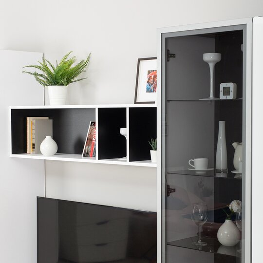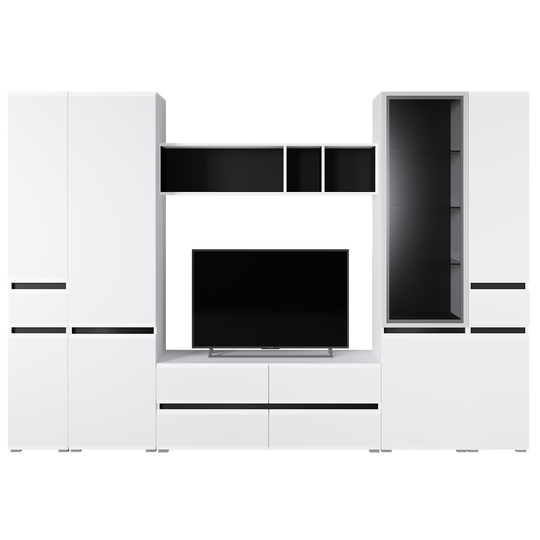 Современное, модное и стильное решение для гостиной - коллекция Сидней. Лаконичные белые глянцевые фасады создают ощущение чистоты и свежести, лёгкости, свободного пространства. Акцентом выступают чёрные горизонтальные вставки между фасадами и серое тонированное стекло витрины. Фасады могут открываться за край, либо нажатием, с помощью механизма push-to-open. Все распашные фасады оснащены доводчиками, что обеспечивает плавное закрывание и исключает удар о корпус.