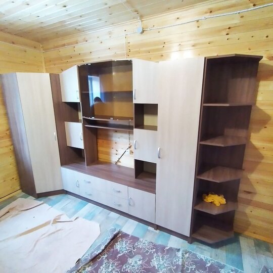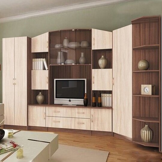 Открытый угловой стеллаж для гостиной Макарена дополнит шкаф и придаст завершенность композиции. На полках стеллажа можно хранить все нужные мелочи и книги.