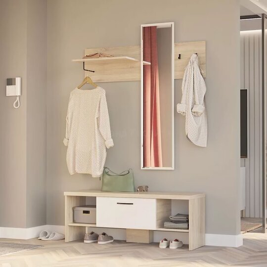 Вешалка с зеркалом Колибри 2-3820 поможет со вкусом обустроить стильную и уютную прихожую. Изделие оснащено зеркалом, штангой для вешалок и полочкой для головных уборов. Вешалка комплектуется с тумбой для обуви Колибри 2-0720. Такой комплект можно поставить в маленькую прихожую.