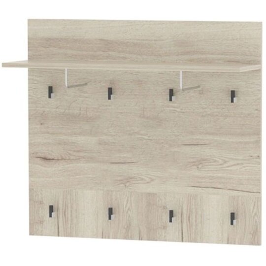 Настенная вешалка подходит для установки в небольшой прихожей. Модель не занимает много места, при этом позволяет аккуратно повесить на крючках повседневную верхнюю одежду, а на полочке — хранить головные уборы или коробку с сезонными аксессуарами. Сочетается с тумбой под обувь ПМ-6 из этой коллекции.