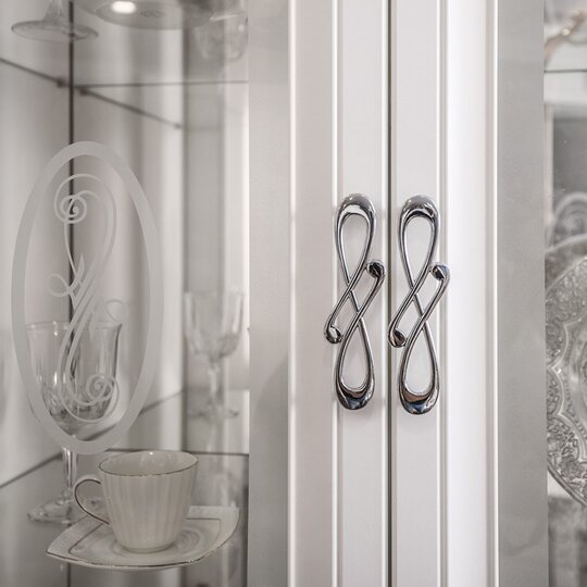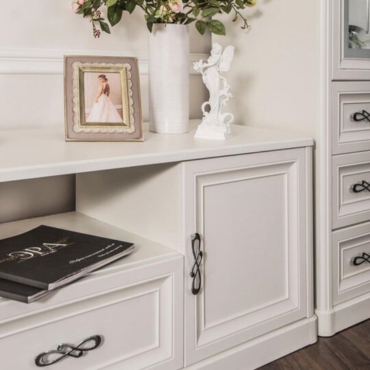 Гостиная Мишель -  элегантная белая мебель на монолитном основании, с лаконичным карнизом и с фрезерованными фасадами, декорированными фантазийными хромовыми ручками. Мебель выполнена из качественных материалов с использованием итальянской фурнитуры. В коллекцию входят витрины трех размеров, тумбы ТВ, комод и зеркало.