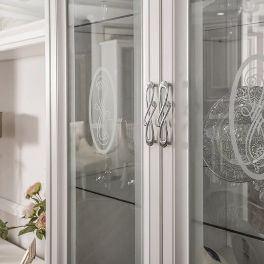 Классическая витрина с двумя стеклянными полками за распашными застекленными дверцами и с тремя выдвижными ящичками в основании. Стекло дверцы декорировано медальоном, выполненным пескоструйным методом.