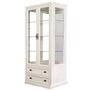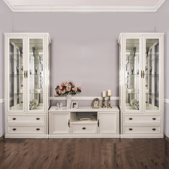 Элегантная классическая витрина с панорамным остеклением выполнена в белой глянцевой тонировке с тремя стеклянными полками за распашными застекленными дверцами. В основании витрины - два выдвижных ящичка на монолитном цоколе.