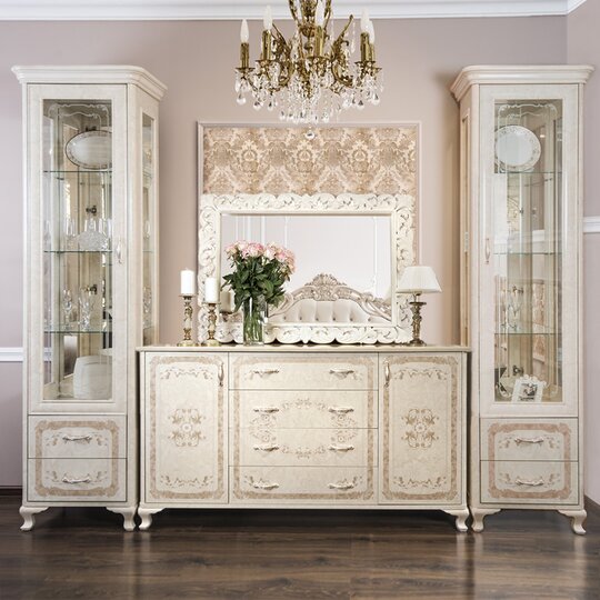 Мебель для гостиной «Патрисия» — стильное решение, отличающееся роскошным видом и великолепными функциональными характеристиками. Корпус изделий изготовлен из высококлассной ЛДСП, а декор — из экологичных ППУ и ПУ. Мебель, размещенная в классическом интерьере, создает уютную и комфортную атмосферу.