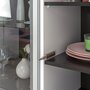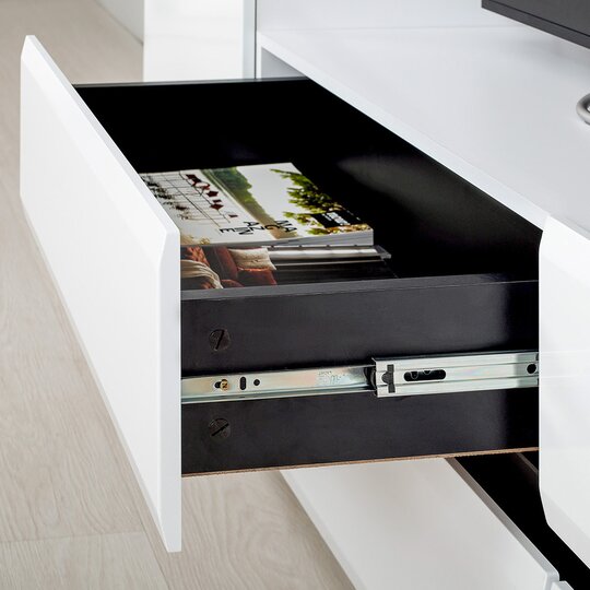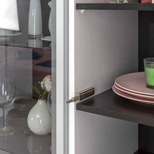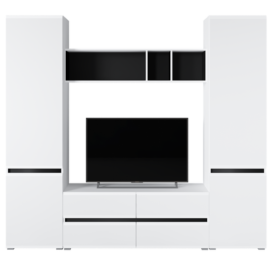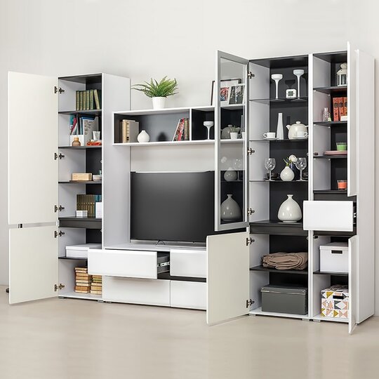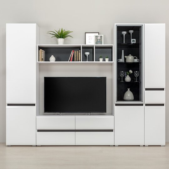 Современное, модное и стильное решение для гостиной - коллекция Сидней. Лаконичные белые глянцевые фасады создают ощущение чистоты и свежести, лёгкости, свободного пространства. Акцентом выступают чёрные горизонтальные вставки между фасадами и серое тонированное стекло витрины. Фасады могут открываться за край, либо нажатием, с помощью механизма push-to-open. Все распашные фасады оснащены доводчиками, что обеспечивает плавное закрывание и исключает удар о корпус.