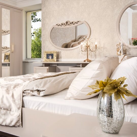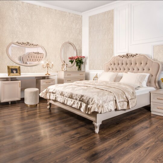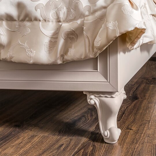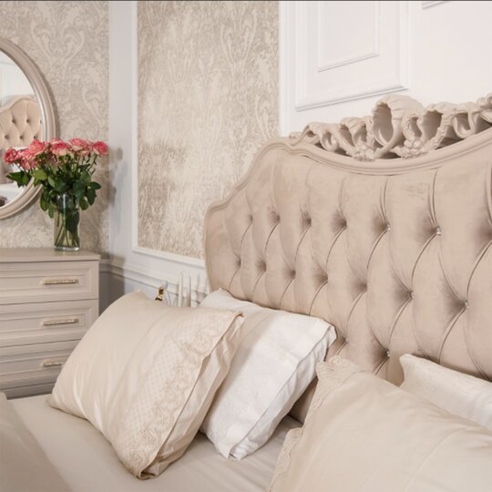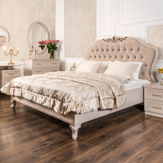 Утонченные элементы, роскошная обивка, витиеватые накладки доставят эстетическое наслаждение своим владельцам. Бежевый цвет «мокко» мебели позволяет визуально увеличить пространство спальни, подчеркнуть важные детали, добавив в пространство легкости и света.
