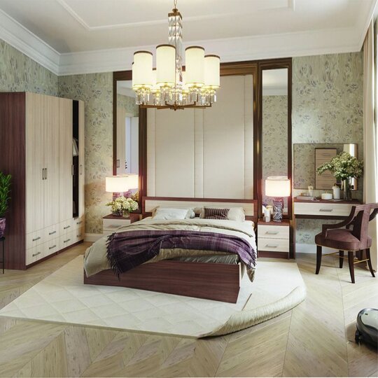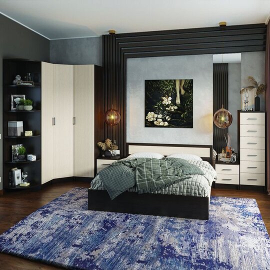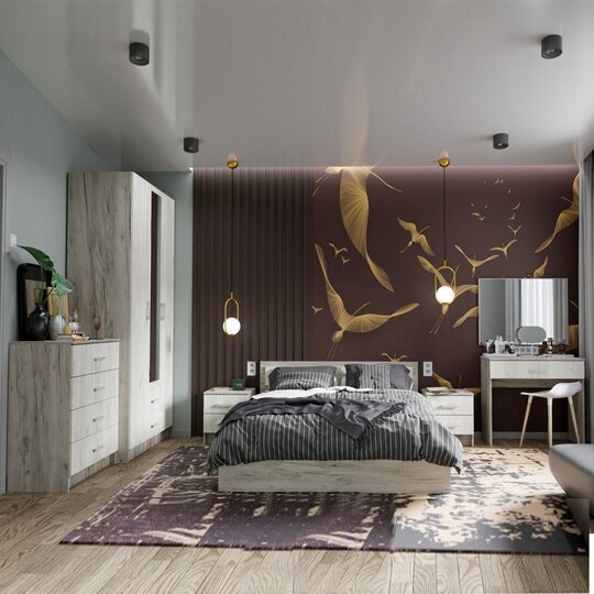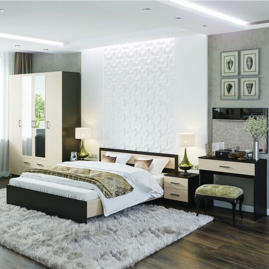 Стильный и яркий комплект для спальни Гармония впечатляет оригинальным дизайном и простотой форм. Такая мебель станет незаменимым дополнением современного интерьера, в котором красота и функциональность имеют значение. Теперь в вашей комнате все настраивает на полноценный отдых.  Вся мебель производится из качественного ЛДСП, отличающегося высокой прочностью. Для удобства использования все дверцы и ящички дополнены стильными и лаконичными ручками, добавляющими общей картине изящности. Столешницы тумбочках можно использовать с толком, разместив на них фотографии, ночник, вазу, любимые книжки и многое другое. Комплект для спальни Гармония является воплощением хорошего вкуса и современности. Он выполнен в современном стиле и полностью соответствует основным канонам этого направления.