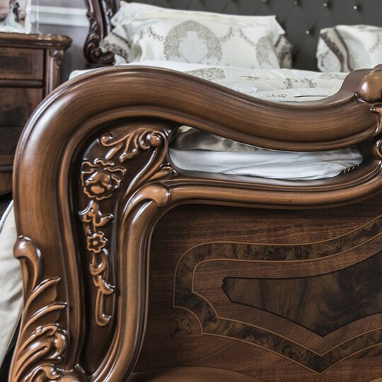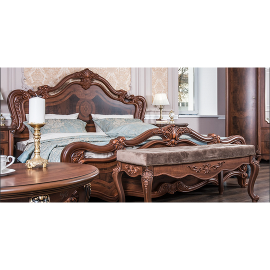 Спальня Илона выполнена в роскошном стиле «rococo». Сочетание элегантности форм , классического оформления и высоко художественного исполнения сериграфических композиций (шелкография) создает из спальни истинный шедевр , в котором искусство доведено до совершенства.