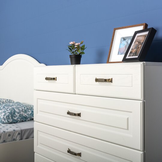 Лаконичная и светлая спальня в сдержанном современном стиле. Внешний вид коллекции создаёт впечатление простоты и ясности, но суть скрывается в деталях, невидимых снаружи. На всех изделиях отсутствует лицевая фурнитура, что подчёркивает чистоту форм и линий. Для удобства открывания, с внутренней стороны фасадов сделан срез. Этот же срез используется как декоративный приём на зеркале и полке. Под спальным местом кровати с мягким изголовьем скрывается вместительная система хранения, доступ в которую осуществляются с помощью подъёмного механизма ортопедического основания. Шкаф для одежды оснащён зеркалом на внутренней стороне одной из створок. Петли широкого открывания (165 градусов) позволяют полностью открыть створку, обеспечивают удобный доступ к содержимому и увеличивают функциональность зеркала.