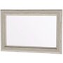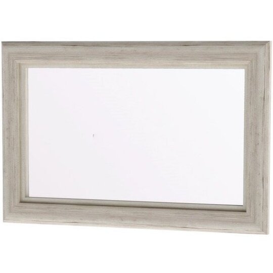 Представленное зеркало является навесным и имеет размеры 900*550 мм. Обрамление у него простое, но красивое. Широкое и светлое, окрашено в цвет Дуб Галифакс белый. Фактура рамы имитирует натуральное дерево, за счет этого в интерьере добавляется свет и легкость, уют.