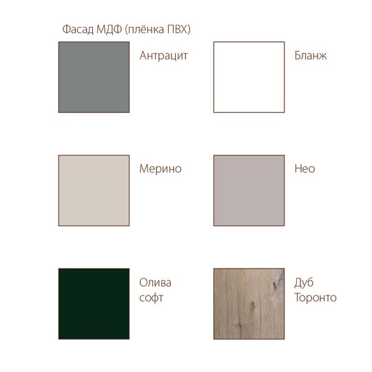 • Антрацит, Бланж, Графит, Грей, Дуб Торонто, Джелато софт, Квазар, Мерино, Нео, Океания, Оливин и Олива софт.