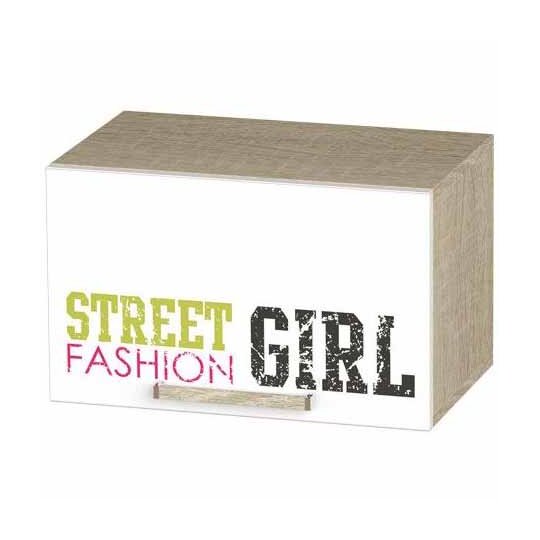 Шкаф антресольный с декорированной фотопечатью створкой на газлифте имеет нишу для белья.