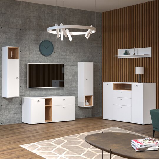 Современная гостиная в лаконичном стиле. Сочетание белого цвета и дуба крафт золотого максимально теплое и уютное.