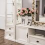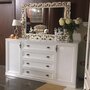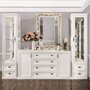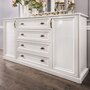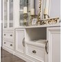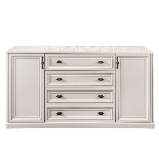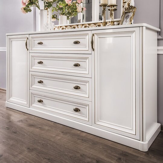Классический белый габаритный комбинированный комод с четырьмя центральными выдвижными ящиками и боковыми отделениями с полками за распашными дверцами.