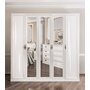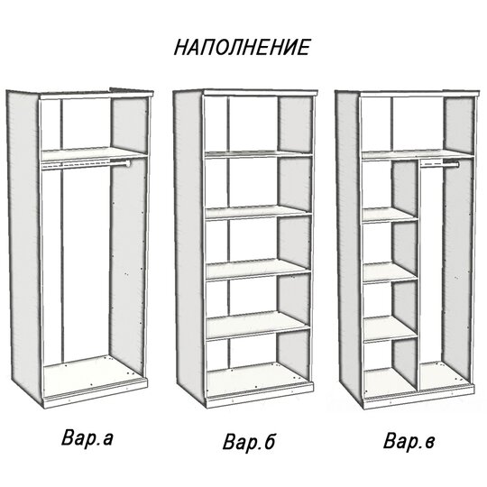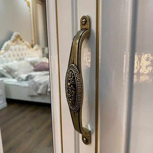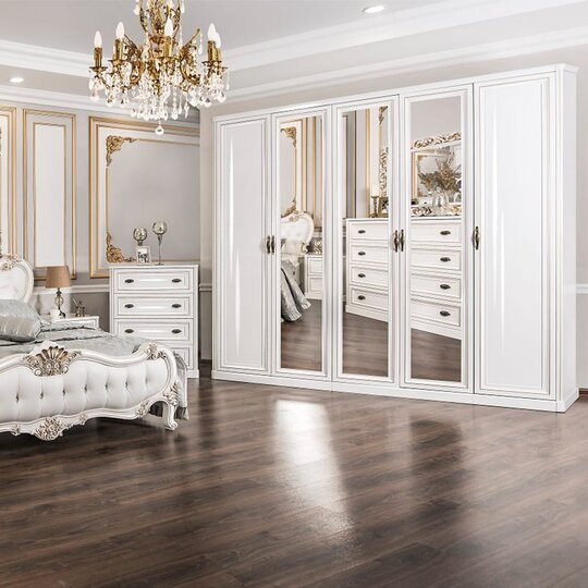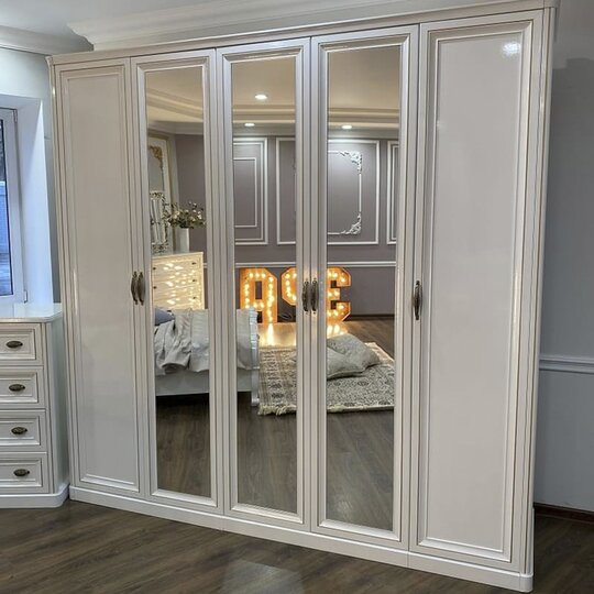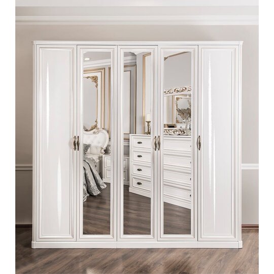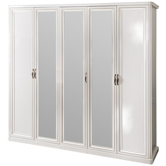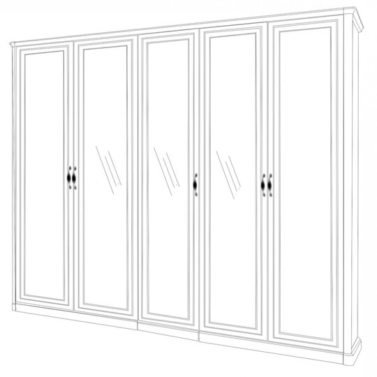 Шкаф 5-ств Натали - роскошный пятистворчатый шкаф с двумя "глухими" боковыми и тремя центральными, оснащенными зеркалами, распашными дверцами выполнен в классическом стиле в белой глянцевой тонировке с рамочными фасадами, декорированными золотой патиной и ручками-скобами цвета состаренного золота. Наполнение шкафа выбирается при сборке: полки  или штанга с антресольной полкой (Вар.а или Вар.б). Для наполнения Вар.в (см. рисунок Наполнение 2-ств секции) необходимо дополнительно приобрести модуль Полки со штангой из коллекции Спальни Натали. Шкаф скомпонован из двух двустворчатых и одной одностворчатой секций и укомплектован завершающими стоевыми из комплекта спальни Натали.