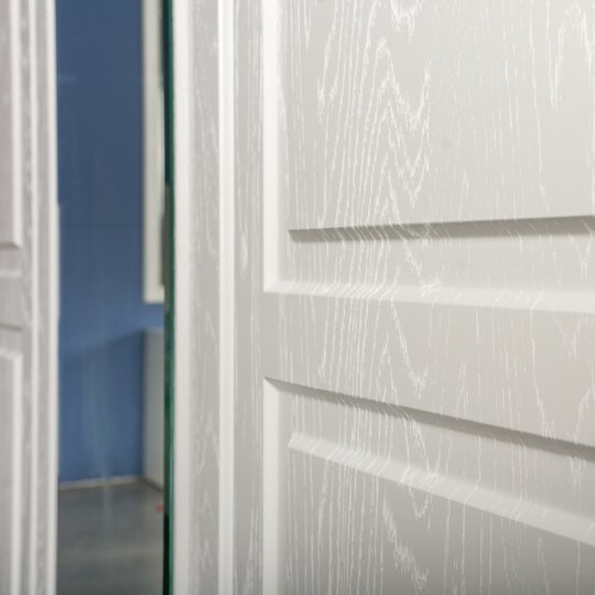 Лаконичная и светлая спальня в сдержанном современном стиле. Внешний вид коллекции создаёт впечатление простоты и ясности, но суть скрывается в деталях, невидимых снаружи. На всех изделиях отсутствует лицевая фурнитура, что подчёркивает чистоту форм и линий. Для удобства открывания, с внутренней стороны фасадов сделан срез. Этот же срез используется как декоративный приём на зеркале и полке. Под спальным местом кровати с мягким изголовьем скрывается вместительная система хранения, доступ в которую осуществляются с помощью подъёмного механизма ортопедического основания. Шкаф для одежды оснащён зеркалом на внутренней стороне одной из створок. Петли широкого открывания (165 градусов) позволяют полностью открыть створку, обеспечивают удобный доступ к содержимому и увеличивают функциональность зеркала.