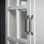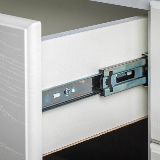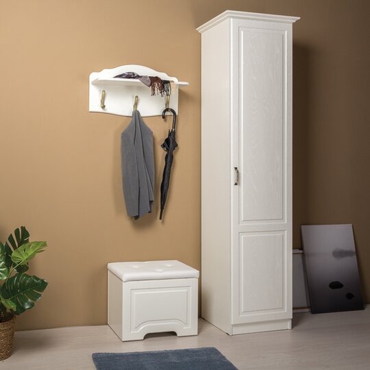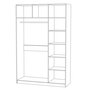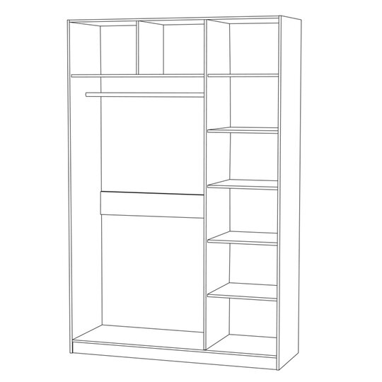 Внутреннее наполнение - полки и штанга, можно увидеть на схеме. Дверцы с лаконичной фрезеровкой и с оригинальными металлическими ручками оснащены четырехшарнирными петлями.