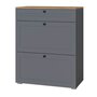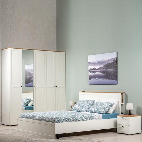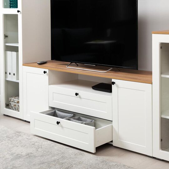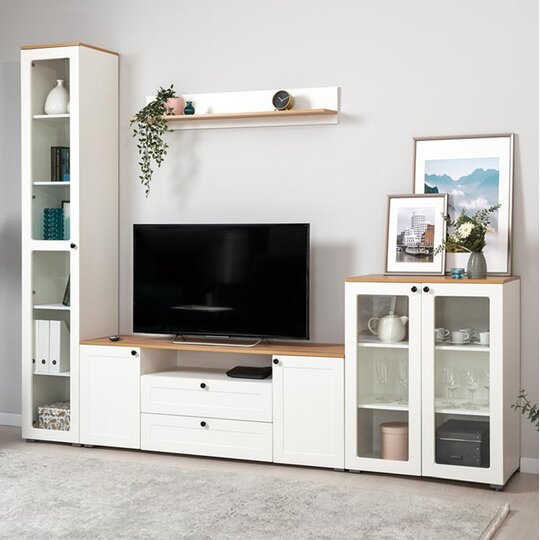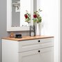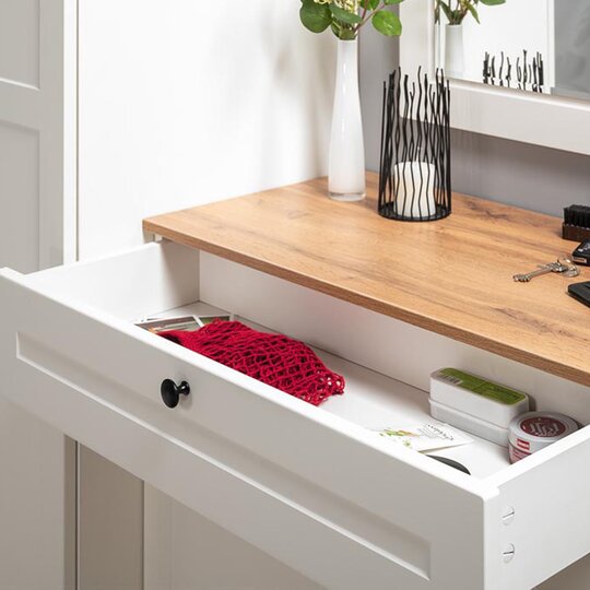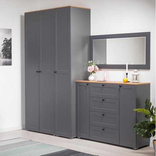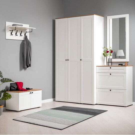 Прихожая доступна в двух цветовых решениях – белый/графит в сочетании с теплым древесным декором.