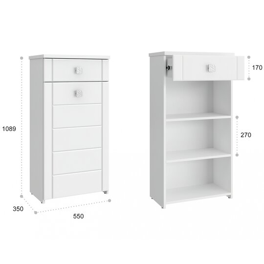 Ширина мм:550 Высота мм:1089 Глубина мм:350 Цвет:белое дерево Материал корпуса:ЛДСП Материал фасадов:МДФ Гарантия:12 месяцев Бренд:Compass