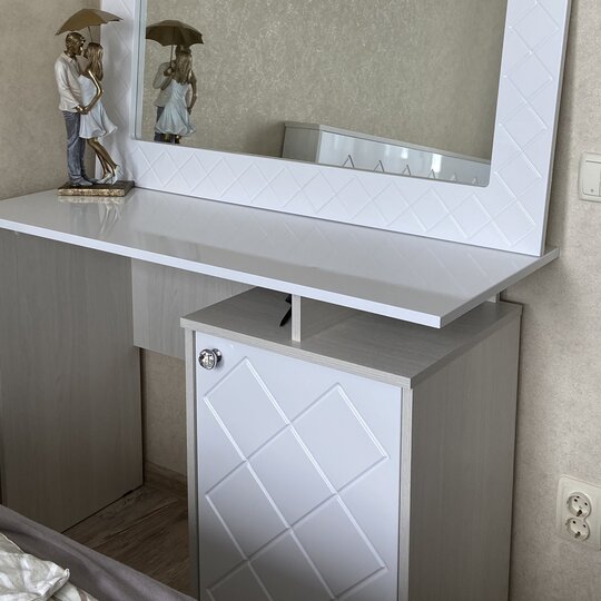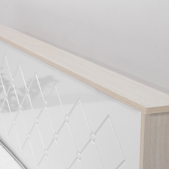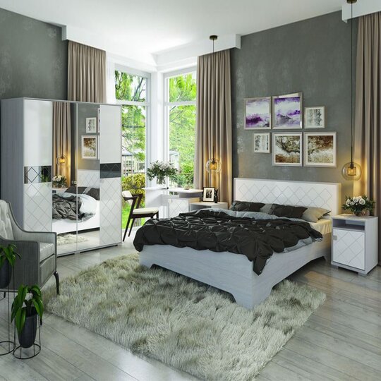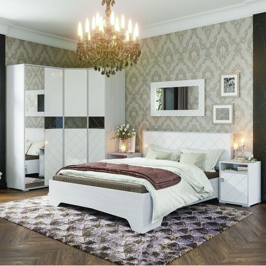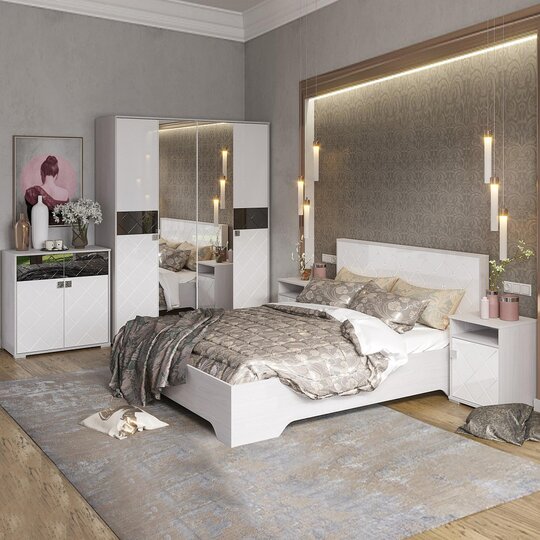 Обволакивающий цвет декора белый глянец светлый наполнит спальню уютом и чистотой, настраивая на отдых, в то время как текстура натурального дерева привнесет в неё умиротворение и спокойствие. Простые формы, четкие линии и декоративные элементы делают спальню Сальма поистине изящной.