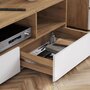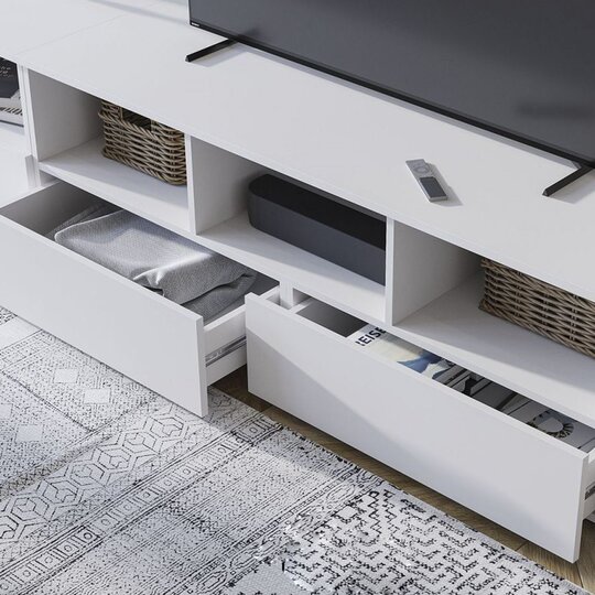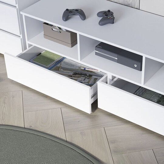 Тумба для телевизора выполнена в скандинавском стиле коллекции, что отлично впишется в интерьер гостиной или спальни. Широкая поверхность для ТВ-панели, есть три открытые полки и два выдвижных ящика используются как место хранения для гаджетов и аксессуаров.