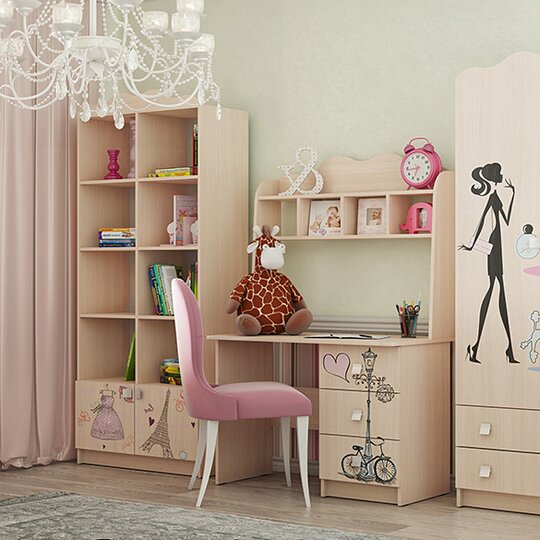 Комод Амели - оригинальный, с принтовыми рисунками на тему Париж, удобный комод для детской или подростковой комнаты. Комод имеет четыре вместительных ящика на роликовых направляющих и фигурную защитную пристенную планку. Материал изготовления: ЛДСП цвета дуб млечный.