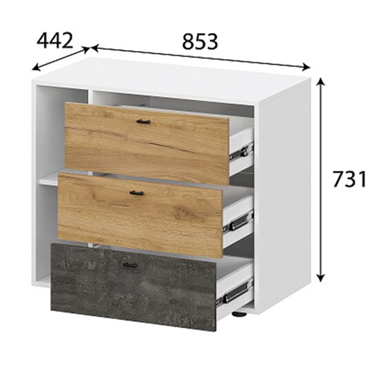 Ширина мм:853 Высота мм:731 Глубина мм:442 Цвет:Дуб Золотой/Железный Камень/Белый Текстурный Материал корпуса:ЛДСП Материал фасадов:ЛДСП Гарантия:12 месяцев Бренд:SV-Мебель