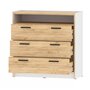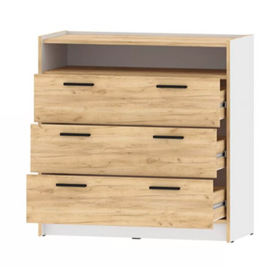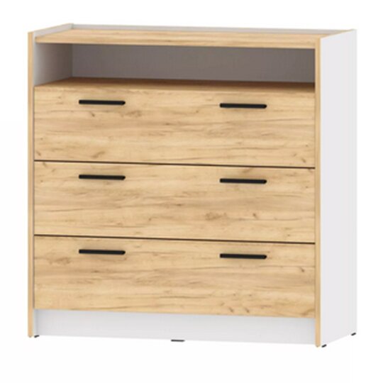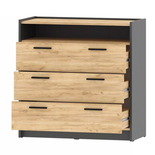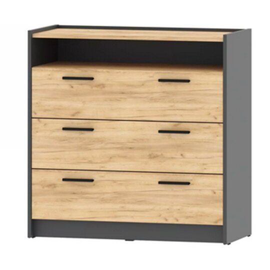 Комод оснащен четырьмя выдвижными ящиками, которые открываются плавно и бесшумно благодаря шариковым направляющим, открытой нишей для удобного хранения вещей, а также представлен в двух размерах, чтобы точно уместиться в параметры вашей комнаты. Черные ручки комода гармонично контрастируют с песочным оттенком фасада.