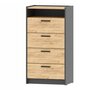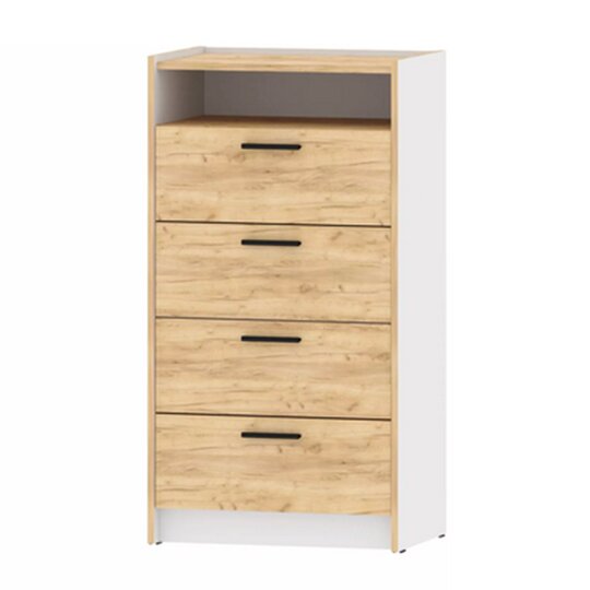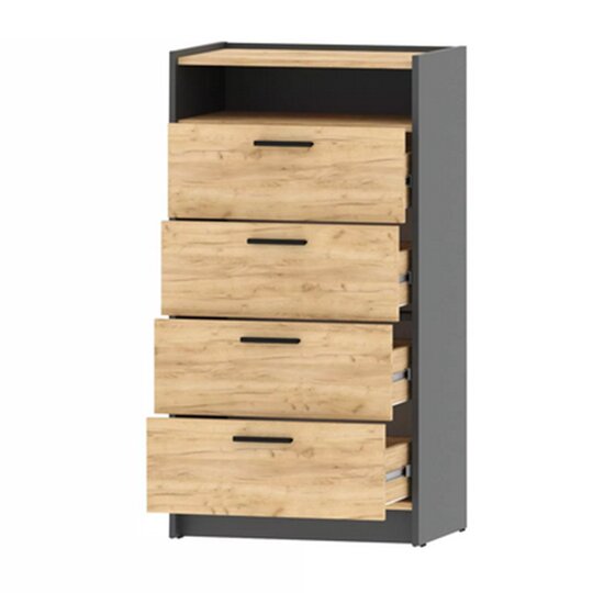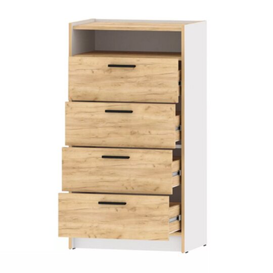 Комод оснащен четырьмя выдвижными ящиками, которые открываются плавно и бесшумно благодаря шариковым направляющим, открытой нишей для удобного хранения вещей, а также представлен в двух размерах, чтобы точно уместиться в параметры вашей комнаты. Черные ручки комода гармонично контрастируют с песочным оттенком фасада.