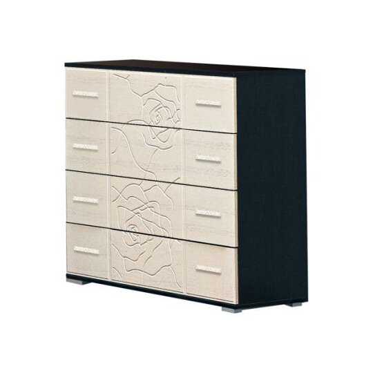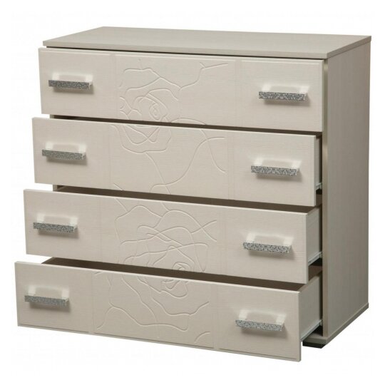 Мебельный гарнитур Розалия обладает изысканным дизайном благодаря декору фасадов в виде распустившихся роз. Комплект включает шкаф с двумя отделениями, двуспальную кровать, две прикроватные тумбы и комод с четырьмя выдвижными ящиками. Производитель предлагает два цветовых решения корпуса: полностью светлый или тёмный в сочетании с нежным тоном фасада. Ручки в виде скоб обеспечивают удобство открывания и подчёркивают изящный стиль мебели.