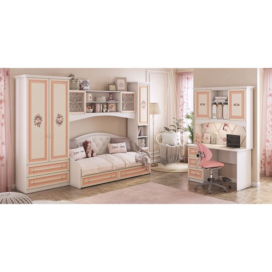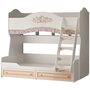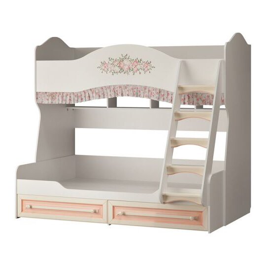 Двухъярусная кровать Алиса выполненная в нежном и утонченном дизайне с патинированными фасадами и керамическими ручками. Бортик верхнего спального места украшает рисунок в стиле "Прованс" и декоративная шторка.